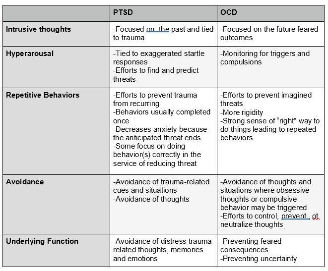 · Misdiagnosis: Symptoms might be misattributed to one disorder or inappropriately attributed to both, delaying appropriate interventions. Assigning a single diagnosis when both are present may delay treatment or have iatrogenic effects. It is important to note that exposure to trauma is common, but exposure alone does not mean an individual has PTSD. Following DSM-5 diagnostic criteria is important, and additional attention needs to be paid to the function of the symptoms when trying to understand if it is PTSD-related, OCD-related, or serving both disorders, but in different ways.